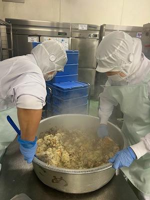 今日は、「ゆうこりん杯」で優勝したメニューで調理場の都合で、実現できなかったメニューです。具だくさん混ぜごはんは、ひじきや鶏肉、えだまめ、しめじなどたくさん具が入っています。給食時間には、優勝者の碓井瑛大さんがみんなの前で、考えるときに気をつけたことについて話してくれました。とてもおいしく彩りもよく、みんな完食でした!