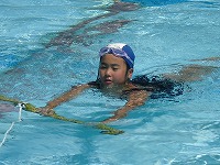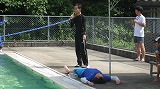 そこで早速プールでやってみました。急いで助けようと思いましたが、慌てると うまくロープを結ぶことができません。