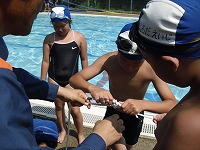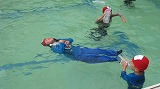 着衣のまま泳ぐ大変さを体感した後、仰向けに浮く方法やペットボトルを使って浮く方法など1年生から6年生まで多くのことを学びました。
