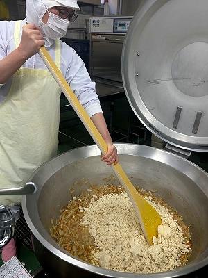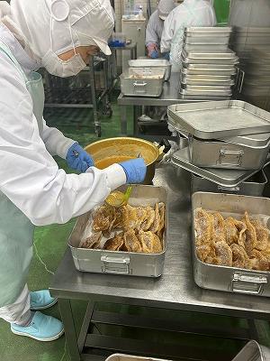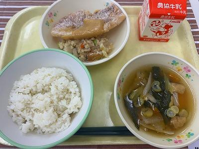 今日は「冬至給食」です。豚肉のから揚げに、ゆずみそをかけました。副菜は、「うの花」です。地元の豆腐やさんからおからをこんにゃくやさつまあげ、たまねぎ、にんじんと一緒に炒め煮にしました。しっとりおいしく仕上がりました。汁には、かぼちゃが入っています。