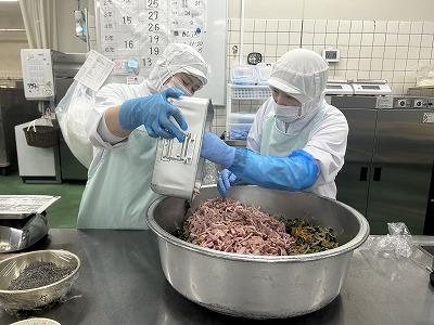 今日の副菜は、新メニューにチャレンジしました。「こまつなの昆布あえ」という名前だけでは新メニューという感じはしませんが、調味料にカリカリにしたニンニクを加え、ごまやごま油も入り風味豊かなあえものに仕上がりました。写真はハムを入れているところです。給食では、ハムも加熱しなければなりません。しっかり温度をあげたハムを安全な温度まで下げてからあえています。