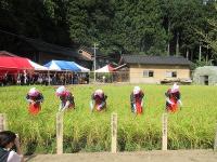 宮中行事の新嘗祭で用られる新米を収穫する献穀田御抜穂式が13日、山中の水田で行われました。本校の5・6年女子児童が刈乙女の姿で水田に横一列に並び、素手で抜穂しました。貴重な体験ができました。