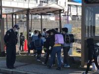 春の交通安全運動(4月6日から4月15日の10日間)中、今朝はおまわりさんもバス停で見守ってくださいました。バスから降りた子ども達が元気にあいさつをしていました。