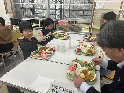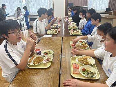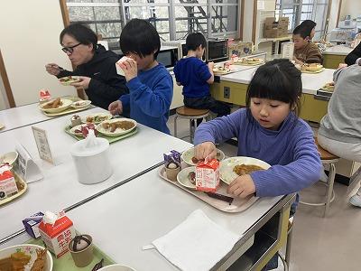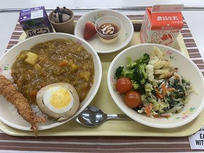 今日はみんなが待ちに待った「バイキング給食」でした。インフルエンザの流行が心配されましたが、なんと全員登校!カレーライスは、すき焼きに使えるような立派な能登牛を使って作りました。牛肉のうま味、甘味が溶け出たカレーに仕上がりました。揚げ物のトッピングは4種類の中から2つ選べるスタイルです。みんな自分が好きなものを選んで食べていました。1~4年生はエビフライが人気、5・6年生にはスコッチエッグが人気でした。