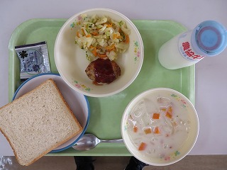 胚芽食パン ハンバーグ 野菜ソテー クラムチャウダー ジャム 牛乳