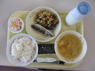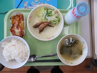 ごはん はたはたのから揚げ 野菜の昆布あえ ラザニア 牛乳
