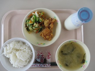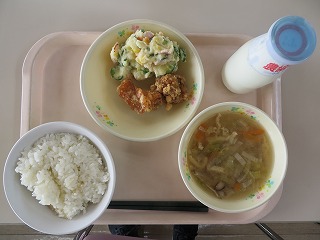 ごはん 鶏肉の唐揚げ ポテトサラダ みそ汁 牛乳