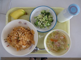 ミックスピラフ コンソメスープ サラダ バナナ 牛乳
