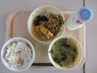 梅ごはん ちくわの2色揚げ 五目きんぴら みそ汁 アメリカンチェリー 牛乳