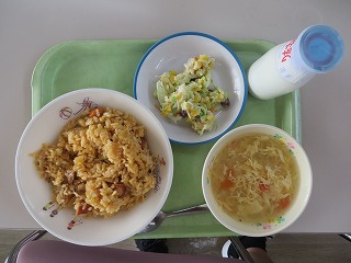 ジャンバラヤ トマトスープ コールスローサラダ 牛乳