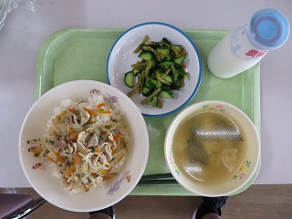 ごはん イカのチリソース シルバーサラダ ワンタンスープ 牛乳
