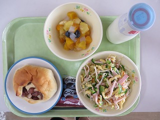豆パン 冷やし中華 フルーツのゼリーよせ 牛乳