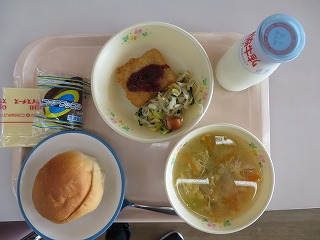 フィッシュバーガー コンソメスープ ウインナーソテー ココアワッフル 牛乳