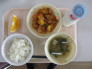 ごはん 酢豚 中華スープ オレンジ 牛乳