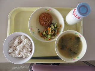 梅ごはん かぼちゃチーズフライ おひたし みそ汁 牛乳