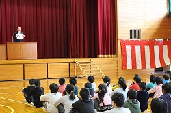 5限目に平成27年度の修了式がありました。校長先生から、1年間のお勉強を無事に終えたことへの子ども達へ「おめでとう」の言葉と、197日間皆出席の23人へ賞賛の拍手が全校から贈られました。