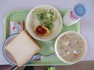 バターロール ミートビーンズオムレツ そえ野菜 ポトフ 牛乳