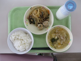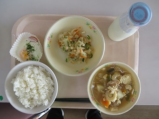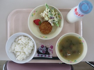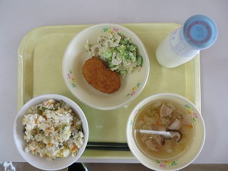 わらびご飯 春雨スープ 豆フライ 竹輪のサラダ 牛乳