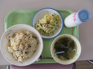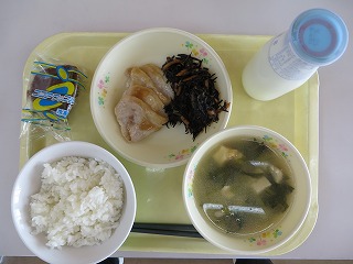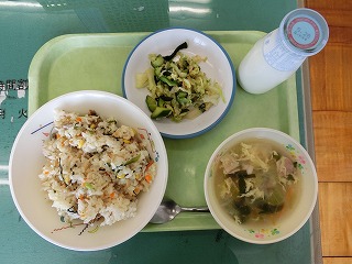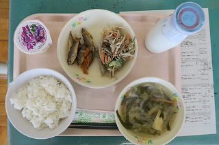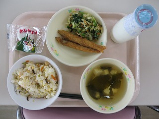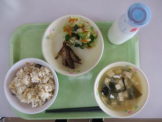 炊き込みご飯 はたはたの唐揚げ 野菜の昆布漬け みそ汁 牛乳