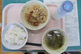 ごはん 鶏肉の唐揚げ うの花 みそ汁 牛乳