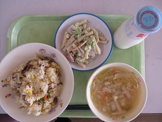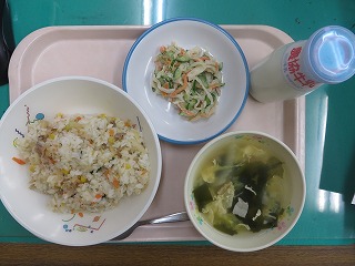牛肉チャーハン 中華スープ いかくんサラダ 牛乳