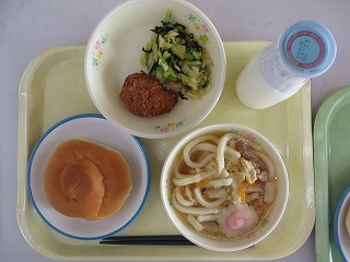 ミルクロール 親子うどん えびカツ おひたし 牛乳