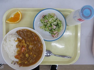 大豆いりカレーライス サラダ オレンジ 牛乳