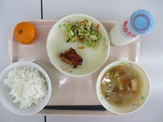 ごはん 鶏肉のてり焼き ごま酢あえ のっぺい汁 みかん 牛乳