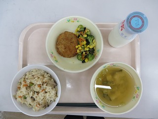 炊き込みご飯 あじのメンチカツ わかめサラダ みそ汁 牛乳