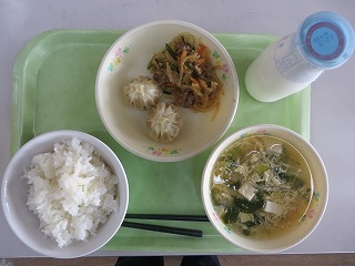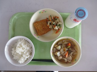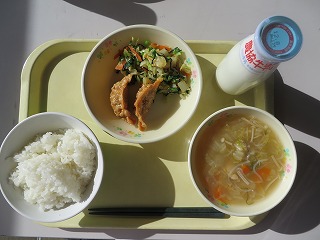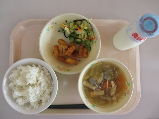 ごはん 揚げぎょうざ おひたし とり野菜 牛乳