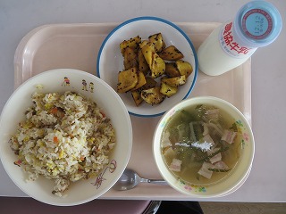 ひき肉ときゃべつのチャーハン 中華スープ 大学芋 牛乳