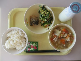 ごはん ふりかけ 鯖の味噌煮 おひたし 鶏肉の具だくさん汁 牛乳