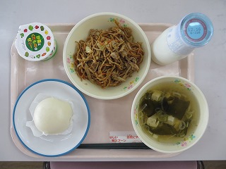 肉まん 焼きそば わかめスープ ゼリー 牛乳