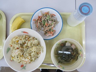 高菜チャーハン 中華スープ ごぼうサラダ バナナ 牛乳