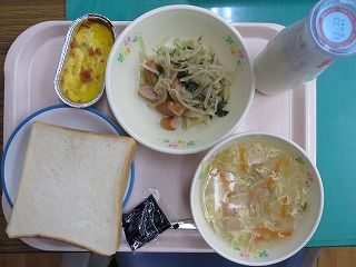 食パン かぼちゃと豆のグラタン ウインナーソテー コンソメスープ ジャム 牛乳