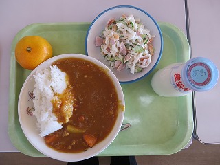 ごはん 魚の甘辛 柿サラダ キムチスープ 牛乳