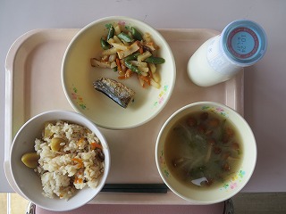 秋の香りご飯 さんまの塩焼き じゃがいものきんぴら みそ汁 牛乳