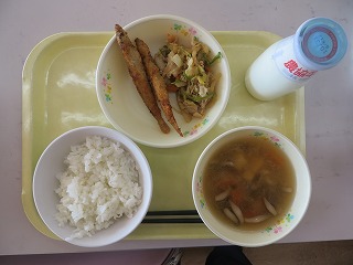 さつまいもご飯 はたはたの唐揚げ れんこんのきんぴら みそ汁 牛乳