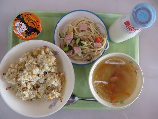 シーチキンチャーハン コンソメスープ スパゲティサラダ ババロア 牛乳