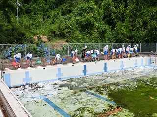 好天の中、2限目から全校でプール掃除に汗を流しました。