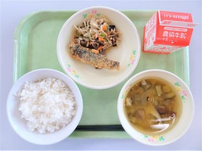 ごはん(ひゃくまん穀)、サバのカレー揚げ、塩昆布あえ、さつま汁、牛乳