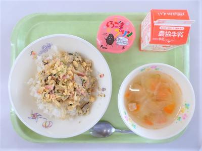 キムタクごはん、きくらげの彩り炒め、とうがんのスープ、牛乳