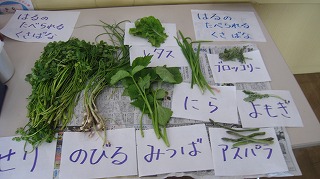 写真は、ランチルームに展示された春の食べられる草花たちです。