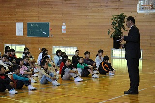 生徒指導の先生は、『3あ』運動(あいさつ)(あきらめない)(あと片付け)と、お話を聞く時の態度のお話でした。話は目(話す人を見る)耳(しっかり聞く)心(納得し頷く)で聞くと良いと話されました。