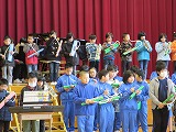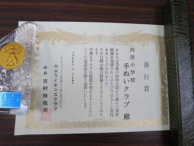 金曜日に行われる(年間10時間程度)の手縫いクラブは、昨年度からぞうきんを縫いあげ、そのぞうきんを特別養護老人ホーム能登穴水聖頌園に贈呈しました。また合奏などを披露し、交流を深めてきました。この取組が認められ、ライオンズクラブより表彰されたのです。