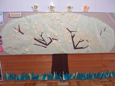 今月の生活目標は「感謝の気持ちを伝えよう!」です。学校の中心になって頑張ってきた6年生に感謝の気持ちを伝えます。その気持ち一つ一つが「かがや木」の花になります。