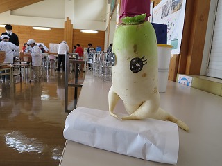 栄養教諭の坂先生が、変わった形の大根を持ってきました。それに目を付けて「大根の妖精?」の完成です。