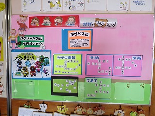 保健室前に「風邪パズル」が出現しました。子どもたちは興味津々です。少しでも風邪予防につながるようにとの取組です。一年生には少し難しいかもしれませんが、これを機会に風邪についての知識が身につき、風邪予防を心がけようとする意識が高まって欲しいと思います。