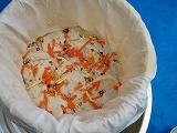 ふるさと教育の一環として、本校5年生が、穴水町曽良地区に伝わるカブラ寿司作りをしました。今日は下漬けです。講師として、畠中先生に来ていただき、下漬け用のカブの加工をしました。大きなカブだったので、包丁が入りにくく難しかったのですが、みんな上手に加工作業を行いました。来週は、いよいよ本漬けです。