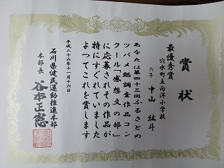 昨日、石川県庁行政庁舎19階展望ロビー交流コーナーにて、表彰式が行われました。総応募数739点の中から選ばれたことは本当に素晴らしいことですね。また、優秀賞に浜中 優実さん、佳作に諸 駿太朗さん、宮谷内美月希さんが選ばれ、向洋小学校にとっては大変名誉なことだと思います。本当におめでとうございます。